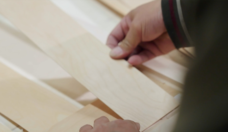 The maple weaving technology is natural and full of elegant atmosphere with a very delicate working process.  First of all, the wood veneers that are close in color and have few defects need to picked out and cut out a uniform size.  Then the thickest 1mm veneers are interlocked and pre-woven, fixed with the back liner, combined with the pre-made door frame and finally adjusted and beautified.
